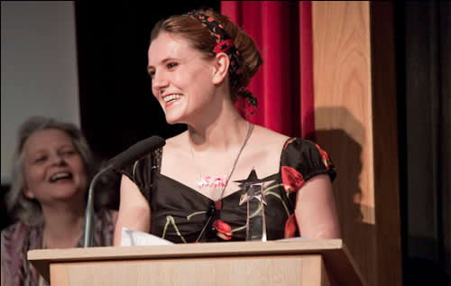 Deborah Miller (top left) presents the Morningstar Award to Orbit's Jenni Hill, accepting on behalf of Helen Lowe.