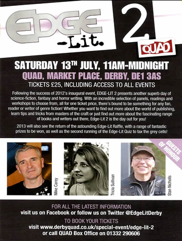 Along with authors Mike Carey and Tricia Sullivan, I’m Guest of Honour at Edge-Lit 2, to be held on Saturday 13th July at the Quad, Derby.