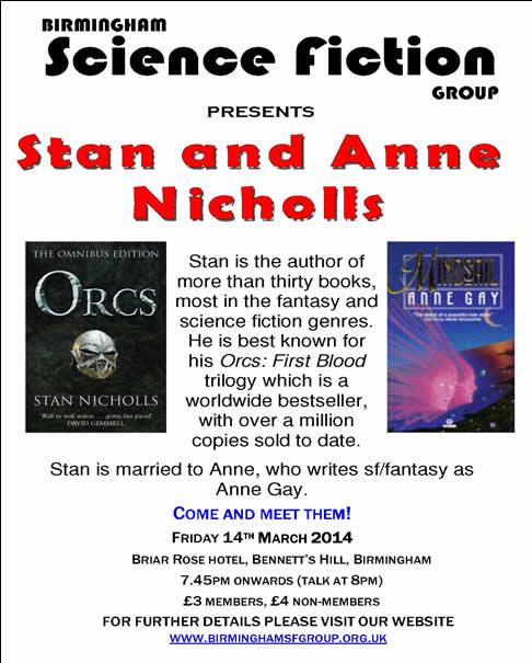 The Birmingham Science Fiction Group is the oldest sf group in the UK, and it’s nice to be invited to address its members again. My wife Anne and I will be guest speakers on Friday 14th March, and I’ll be posting more details here nearer the event. The BSFG’s website is here.
