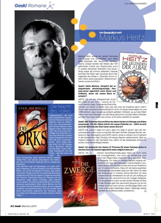Geek! Is a German science fiction/fantasy magazine (similar to UK’s SFX magazine). The May/June issue carries a piece by genre journalist Christian Endres that includes a brief section on my Orcs series and quotes from me. Here’s part of the article -