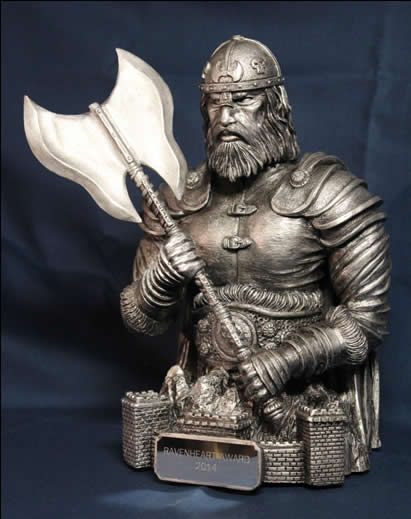 There are three categories - the Legend Award (best novel), the Morningstar (best debut) and the Ravenheart (best cover art) - and this year we’re introducing a new trophy for the Ravenheart. Created by artist Lee Blair, this pewter bust depicts Gemmell’s most celebrated character, Druss, looming over the fortress of Dros Delnoch.