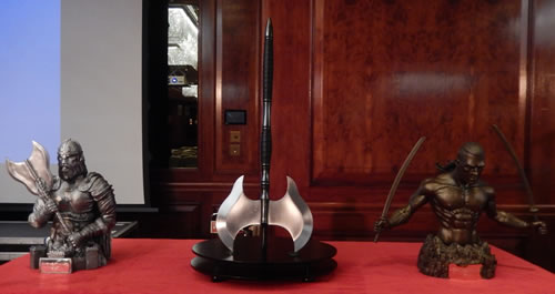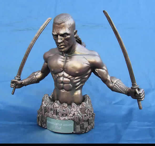 This is the new trophy for the Morningstar Award (best debut novel) to be presented for the first time at this year’s Gemmell Awards ceremony. The trophy was created by Lee Blair, the artist who also made the trophy for the Ravenheart Award (best fantasy book cover art) first presented at last year’s ceremony. The third trophy, for the Legend Award (best novel) is fashioned by Simon Fearnhamm of Raven Armoury.